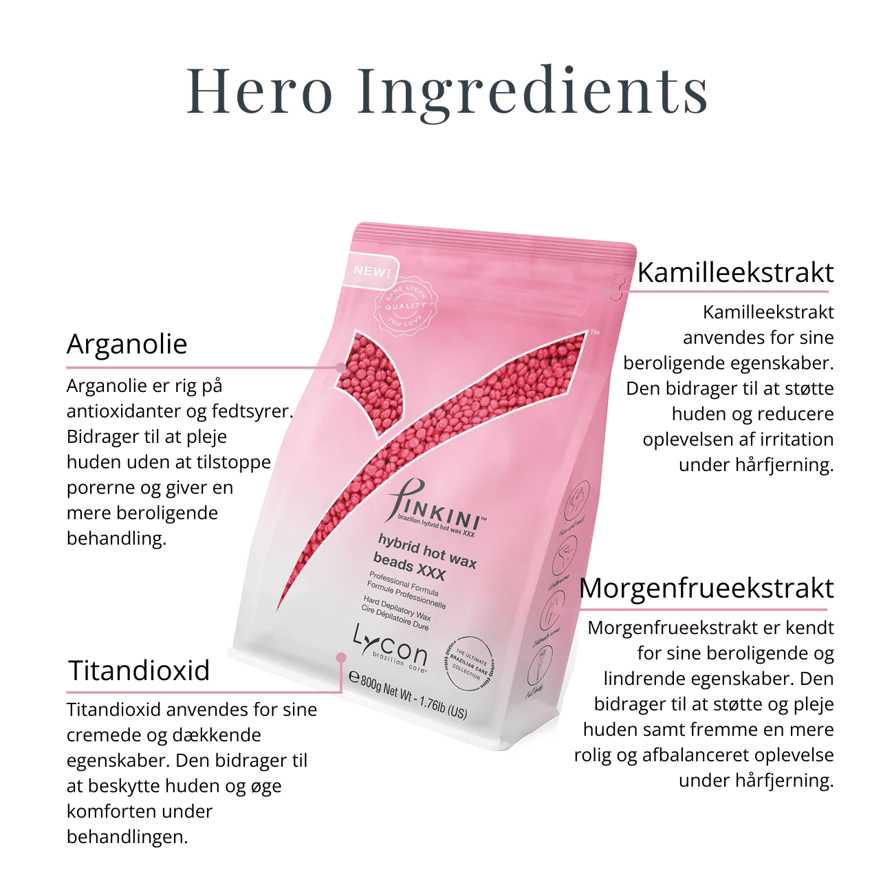Den lave arbejdstemperatur gør det muligt at påføre voksen på samme område op til 5-6 gange uden ubehag, hvilket gør den praktisk talt smertefri. Formuleret med LYCONs unikke Titanium Dioxide-teknologi samt plejende arganolie, kamille og morgenfrue – der beskytter, beroliger og fugter huden.
